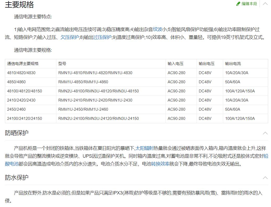 主要技术参数  20A通信电源模块3个, 防雷模块等级C 级1只,通信电源监控模块1台,48V直流馈线断路器50A 2个,30A 8个,20A 6个,信号灯数量16个,通信电源馈线监测模块1台。产品名称:通信电源柜